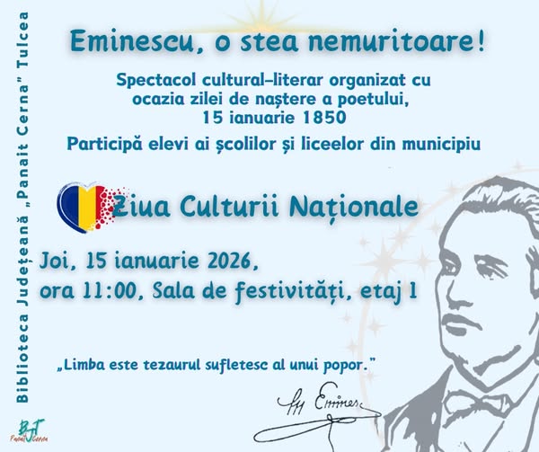 Vă invităm la spectacolul cultural-literar dedicat lui Mihai Eminescu, organizat cu ocazia zilei sale de naștere, 15 ianuarie 1850, în cadrul activităților dedicate Zilei Culturii Naționale. 📅 Data: Joi, 15 ianuarie 2026 🕚 Ora: 11:00 📍 Locație: Sala de festivități, etaj I 🎭 Vor participa elevi ai școlilor și liceelor din municipiu, aducând în scenă […]