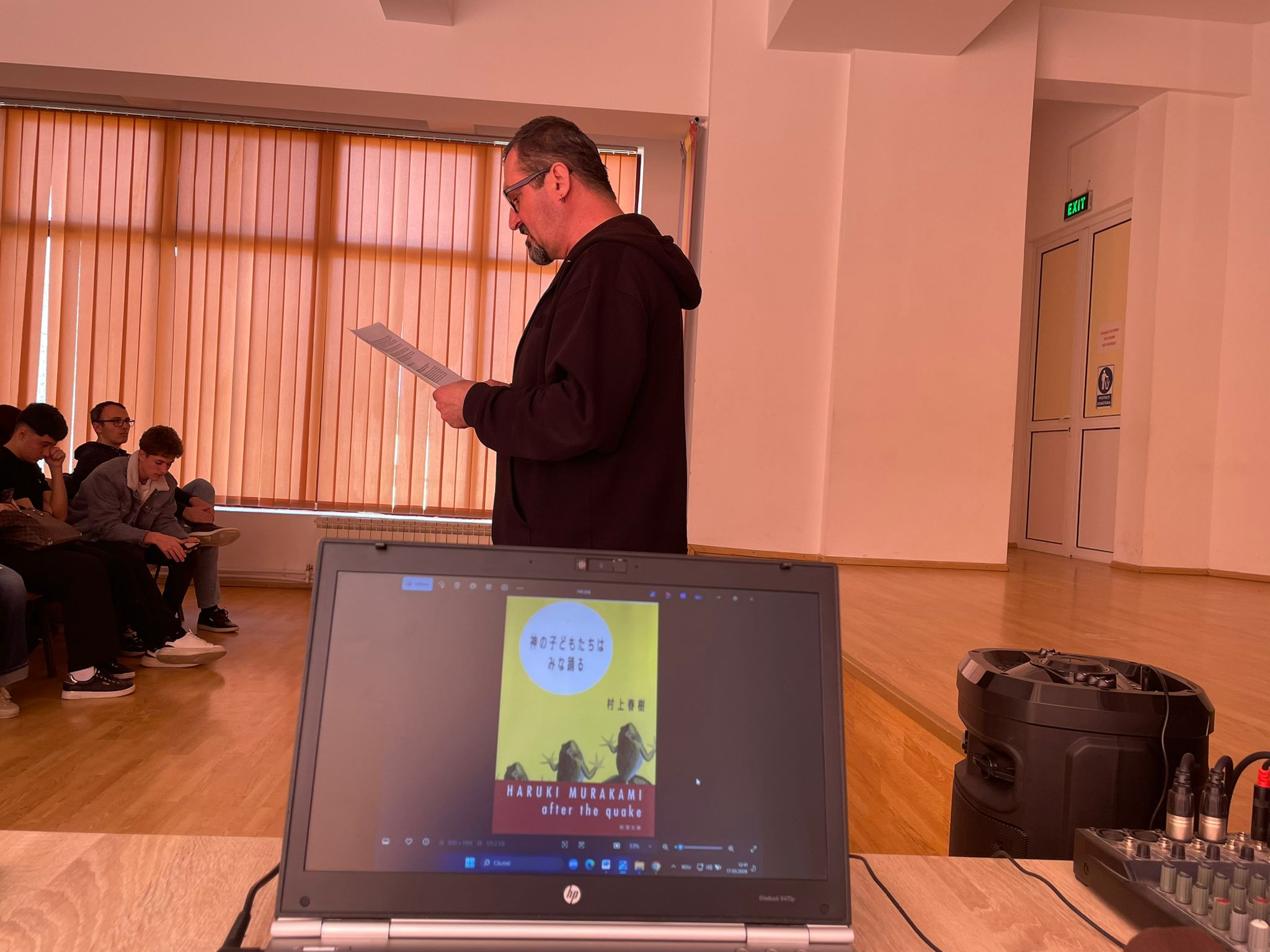 ā La Ć®ntĆ¢lnirea de astÄzi am vorbit cu liceenii despre Haruki Murakami vrute Či nevrute: despre studiile sale universitare, marea sa pasiune pentru jazz, cultul pentru sport, gusturile sale literare Či multe altele. Ćn partea a doua, adolescenČii au ales pasaje/citate din cele Čase povestioare care formeazÄ āDupÄ cutremurā, publicatÄ Ć®n Japonia Ć®n 2000.