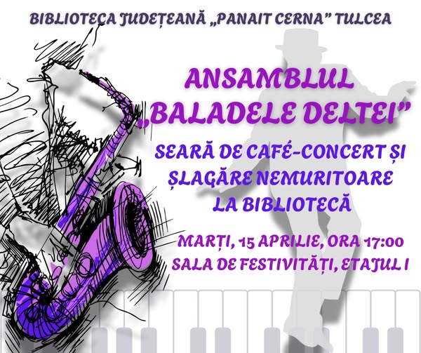 În continuarea parteneriatului comun, Ansamblul Artistic Profesionist „Baladele Deltei” al Municipiului Tulcea va susține marți, 15 aprilie, de la ora 17:00, un concert excepțional la sala de festivități a bibliotecii, cu muzică de café-concert și șlagăre nemuritoare.
