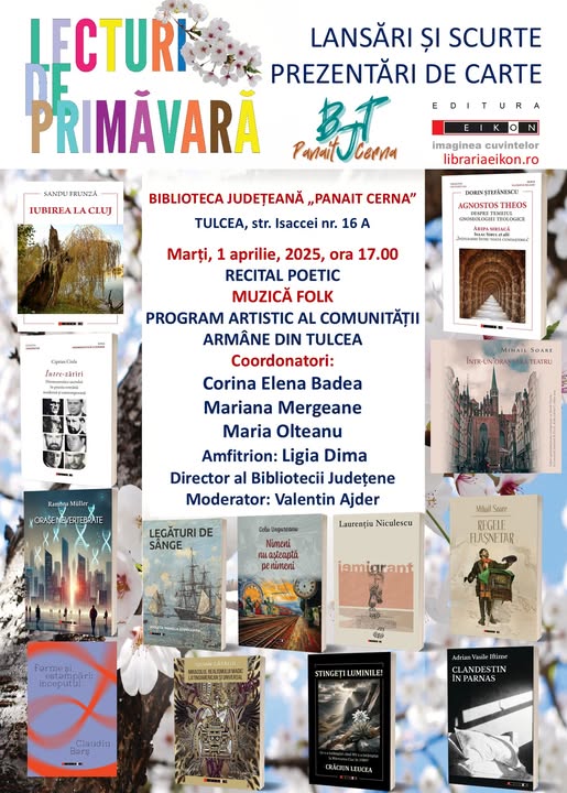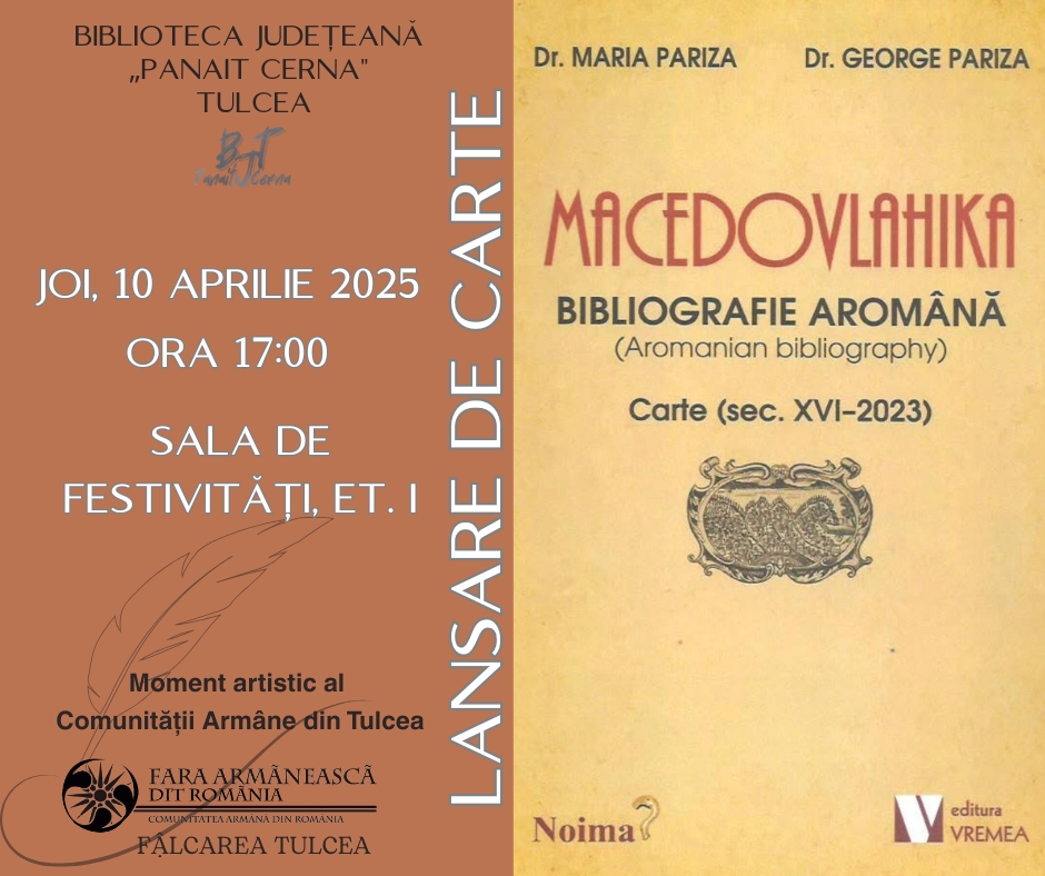 Joi, 10 aprilie 2025, începând cu ora 17:00, la Sala de festivități a bibliotecii va avea loc lansarea volumului „MACEDOVLAHIKA – BIBLIOGRAFIE AROMÂNĂ”, apărută la editura Vremea sub semnătura autorilor Dr. Maria Pariza și Dr. George Pariza. În cadrul evenimentului Comunitatea Armână din Tulcea va prezenta momente artistice.
