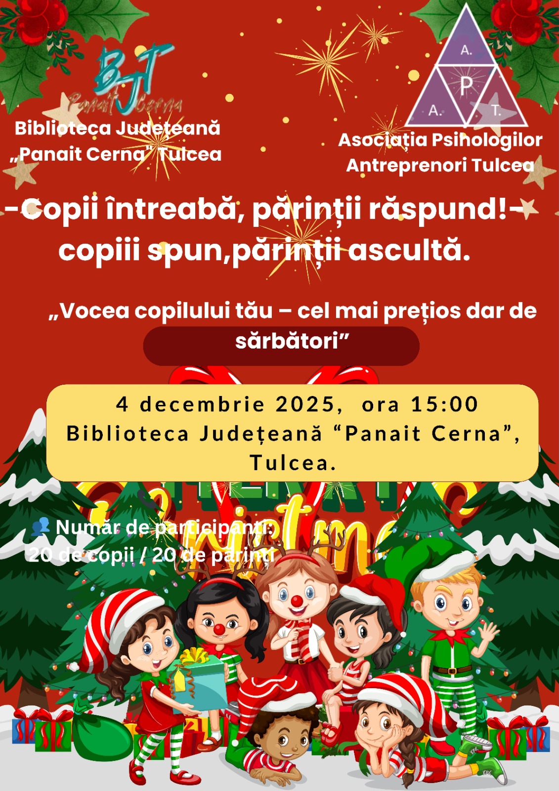 🙂Asociația psihologilor Antreprenori Tulcea și Biblioteca Județeană „Panait Cerna” Tulcea organizează: 🌟 Vocea copilului tău – cel mai prețios dar de sărbători 👧🧒 Copiii vorbesc, părinții ascultă ❤️ „🎄 Eveniment special pentru copii și părinți 🎄 Te invităm la o activitate caldă, plină de emoție și conexiune, unde cei mici își pot împărtăși gândurile, dorințele […]